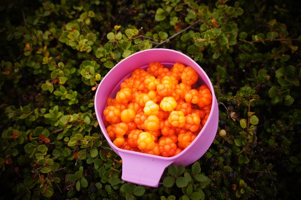 På väg ner mot lägerplatsen hittade vi rejält med hjortron så kvällens dessert var räddad.