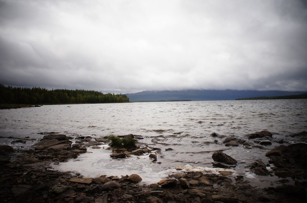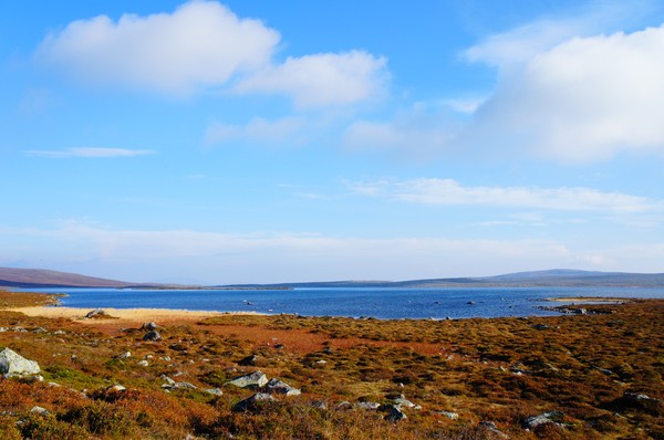 Vidare över Olshöjdens stenparti som skulle vara vår näst sista stenhög och ner till sjöpassagen. Vi pausade en stund vid stranden men bestämde att vi skulle ta en längre paus när vi tagit stigningen upp på Långfjället och även det som skulle vara sista sträckan med stenskravel. Vi klättrade snabbt uppför till bäcken på höjden. Då hade solen gått i moln och åter igen blåste det en hård kylig vind precis som det gjort de senaste dagarna.