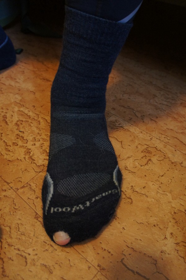 Mina sockor av märket Smartwool är jag inte nöjd med. De har varit jättesköna att gå i. Där har jag inget att anmärka på. Däremot har två av mina tre, inför turen nya par, nötts hål på. Jag var tvungen att köpa nya i Hemavan. Räknar man att varje par gått 20-25 mil så långt är det för kort livslängd på sockor för nästan 300 kr paret.
