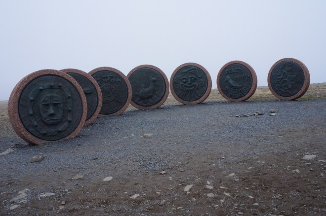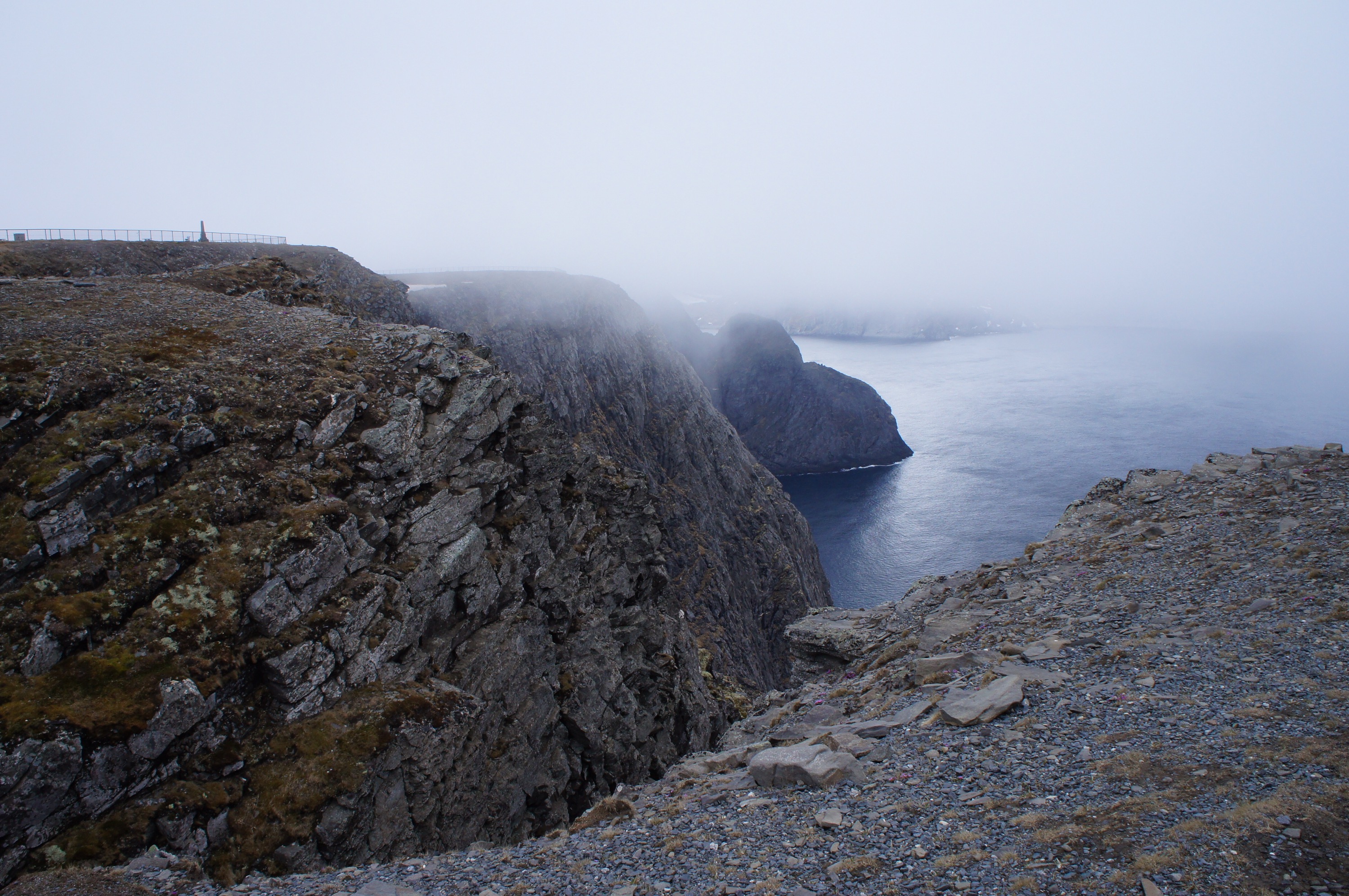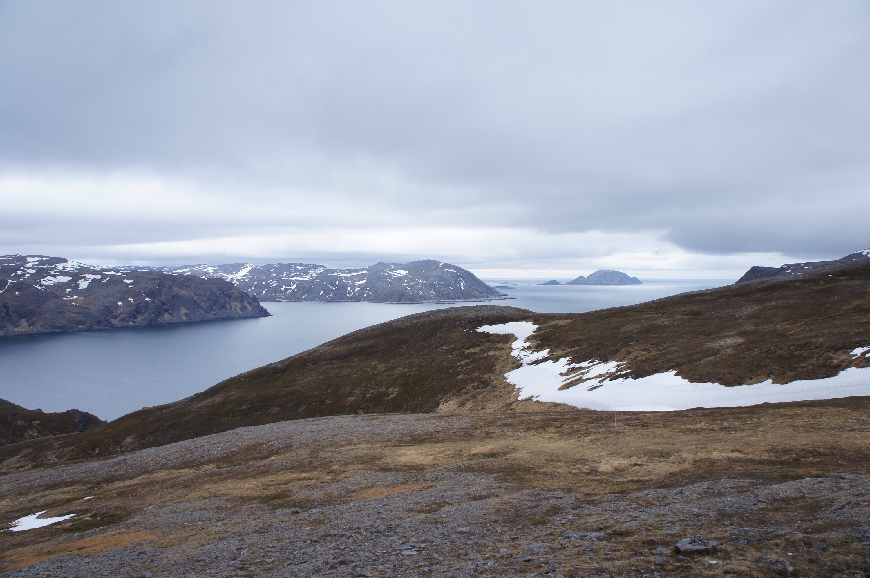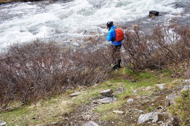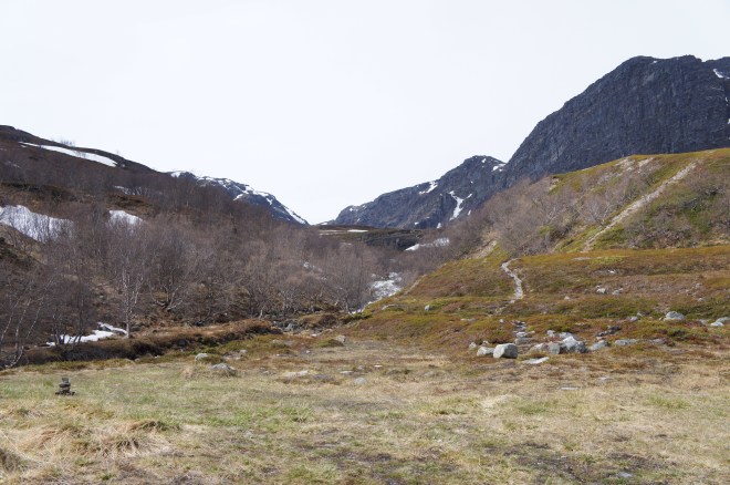 Ännu ett fjäll att passera, inte alls lika högt som det förra men ändå slitsamt. När jag kom upp var jag fullkomligt sjöblöt av svett. Omedelbart började en lång och brant nerförs på andra sidan fjället där duggregn och kyla väntade.