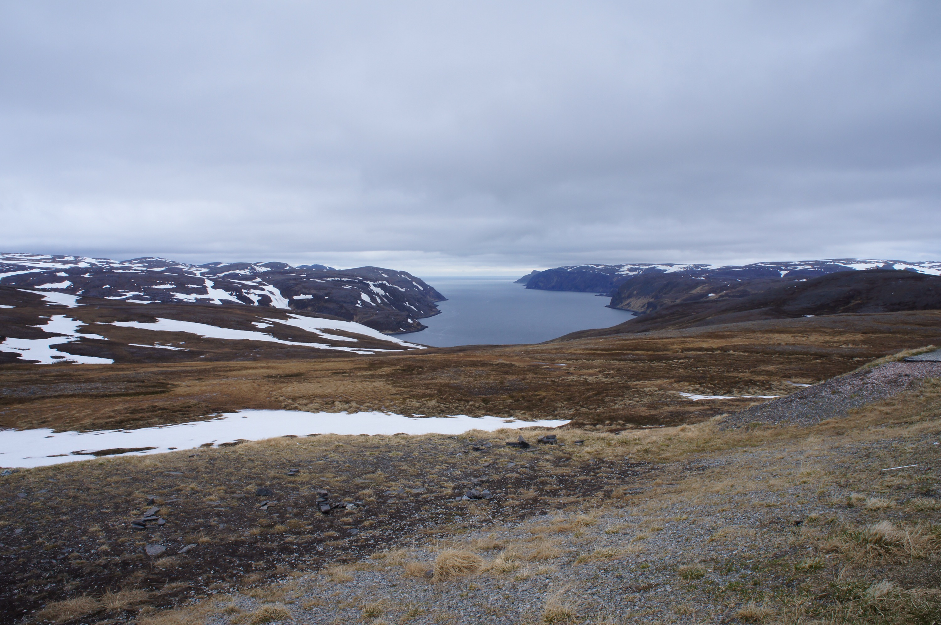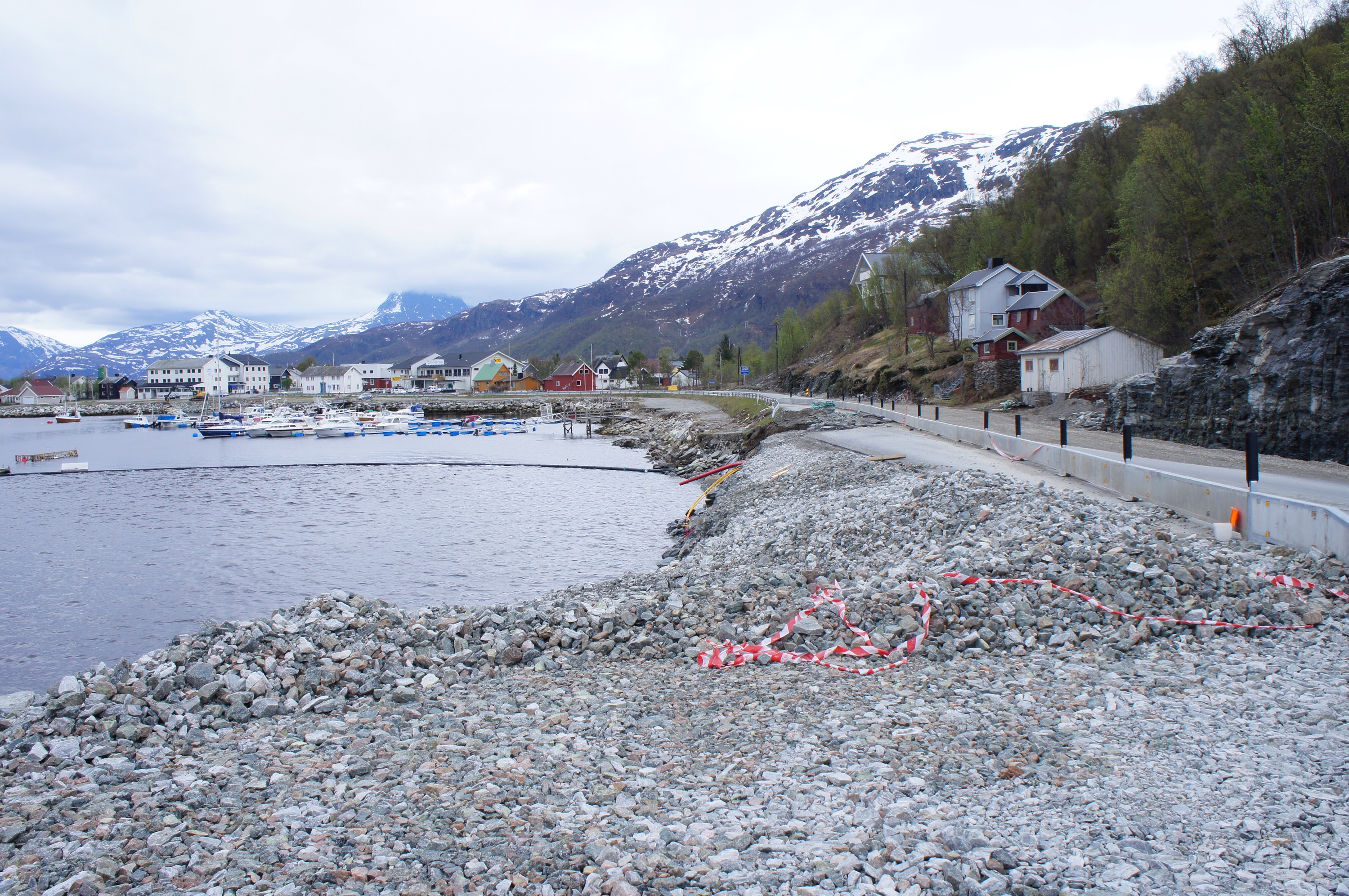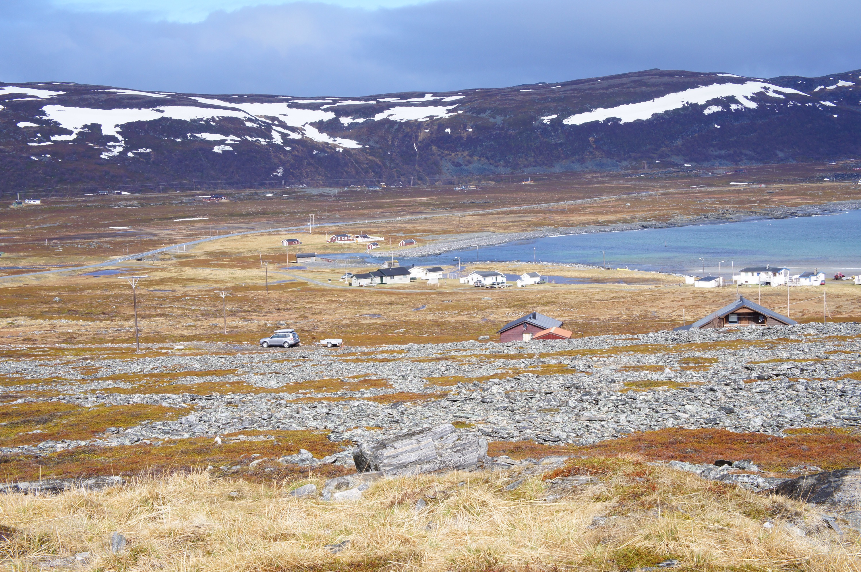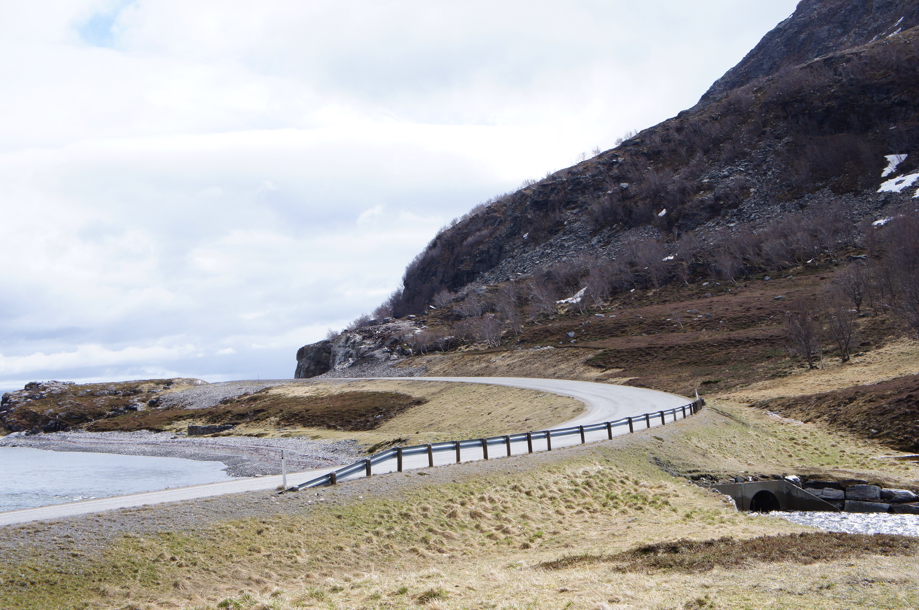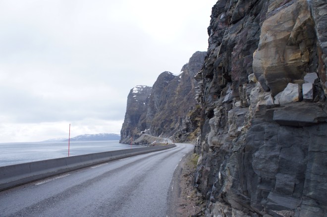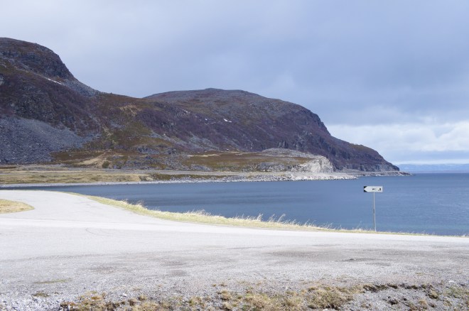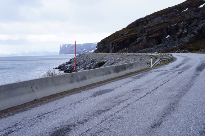 Det var här norr om Storslett som E6 rasade ut i havet på ett par ställen för två veckor sen. Det immebar en omväg på 70 mil över Kautokeino för att komma sig vidare söderut.