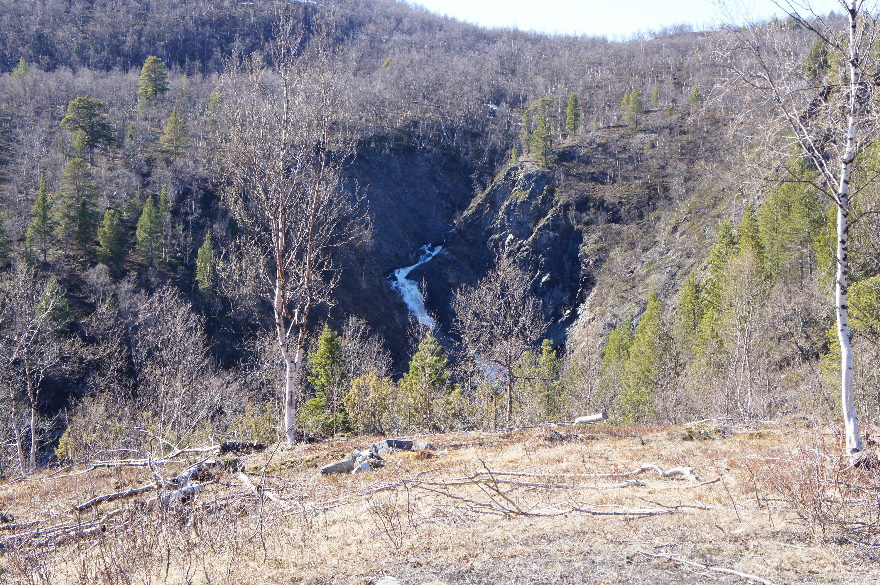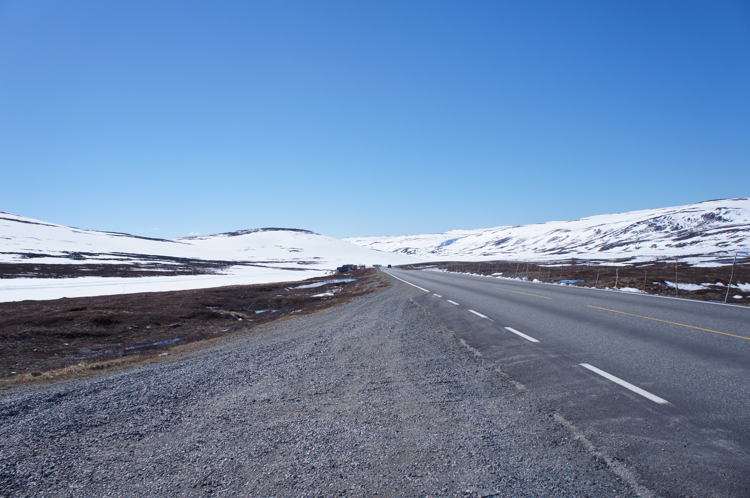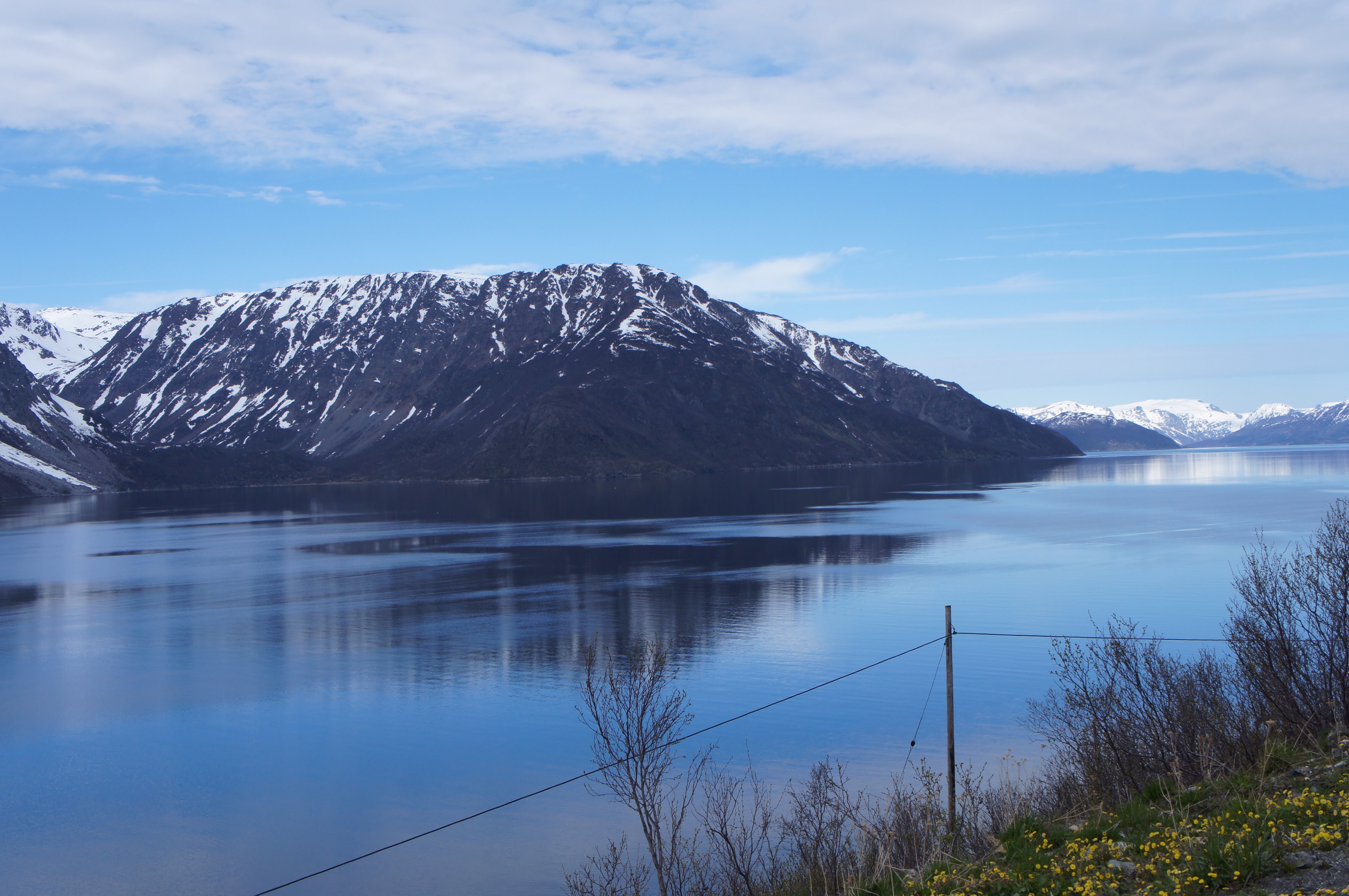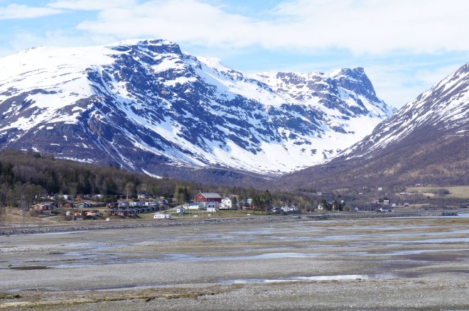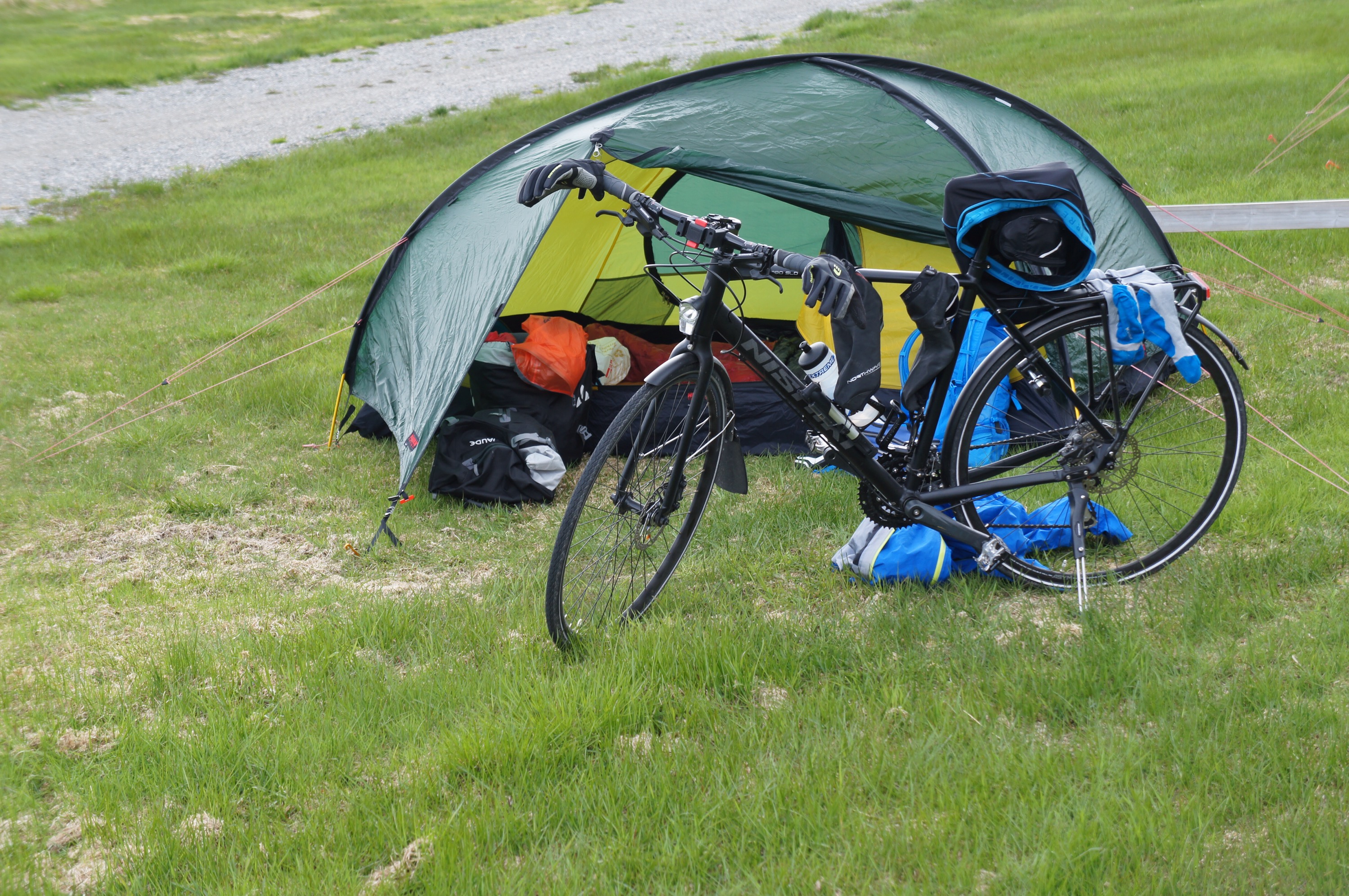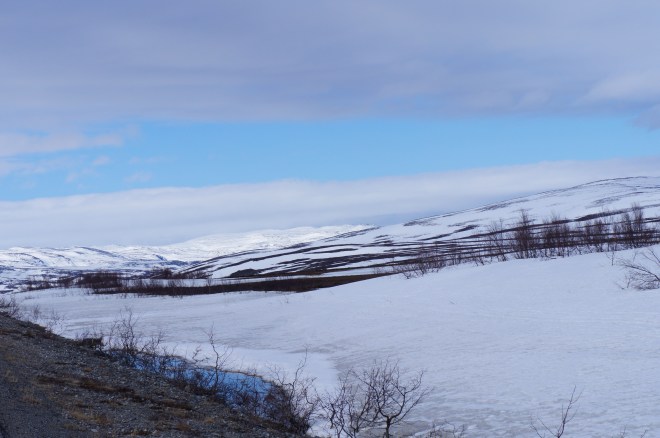 Vi är fortfarande en bra bit norr om Treriksröset trots att vi cyklat rätt långt nu. Norge är ett väldigt långt land. Trots allt har vi kommit så långt söderut så att gullvivorna blommar för fullt. Gräset är snart på g och björkarna har nästan slagit ut.