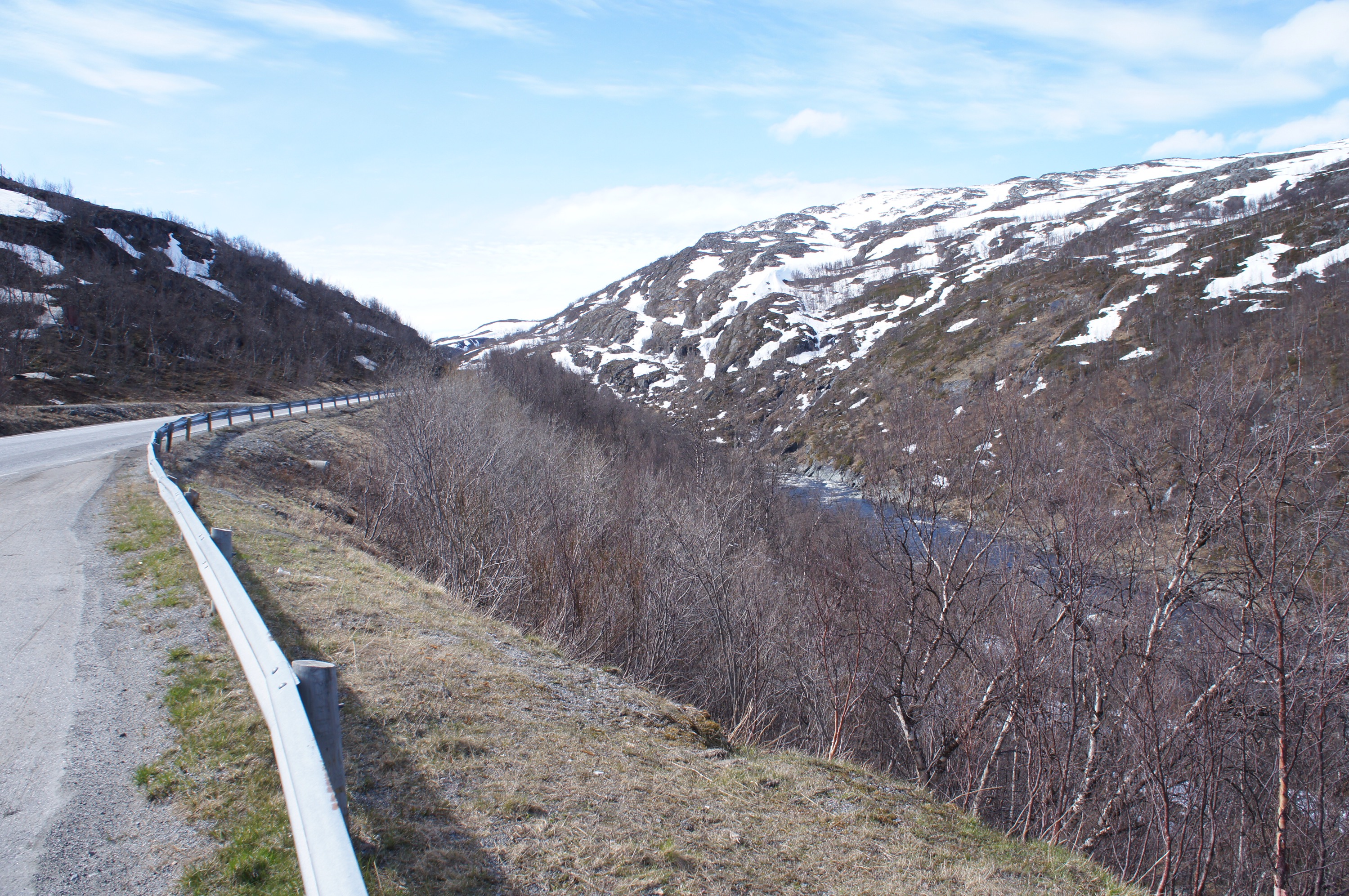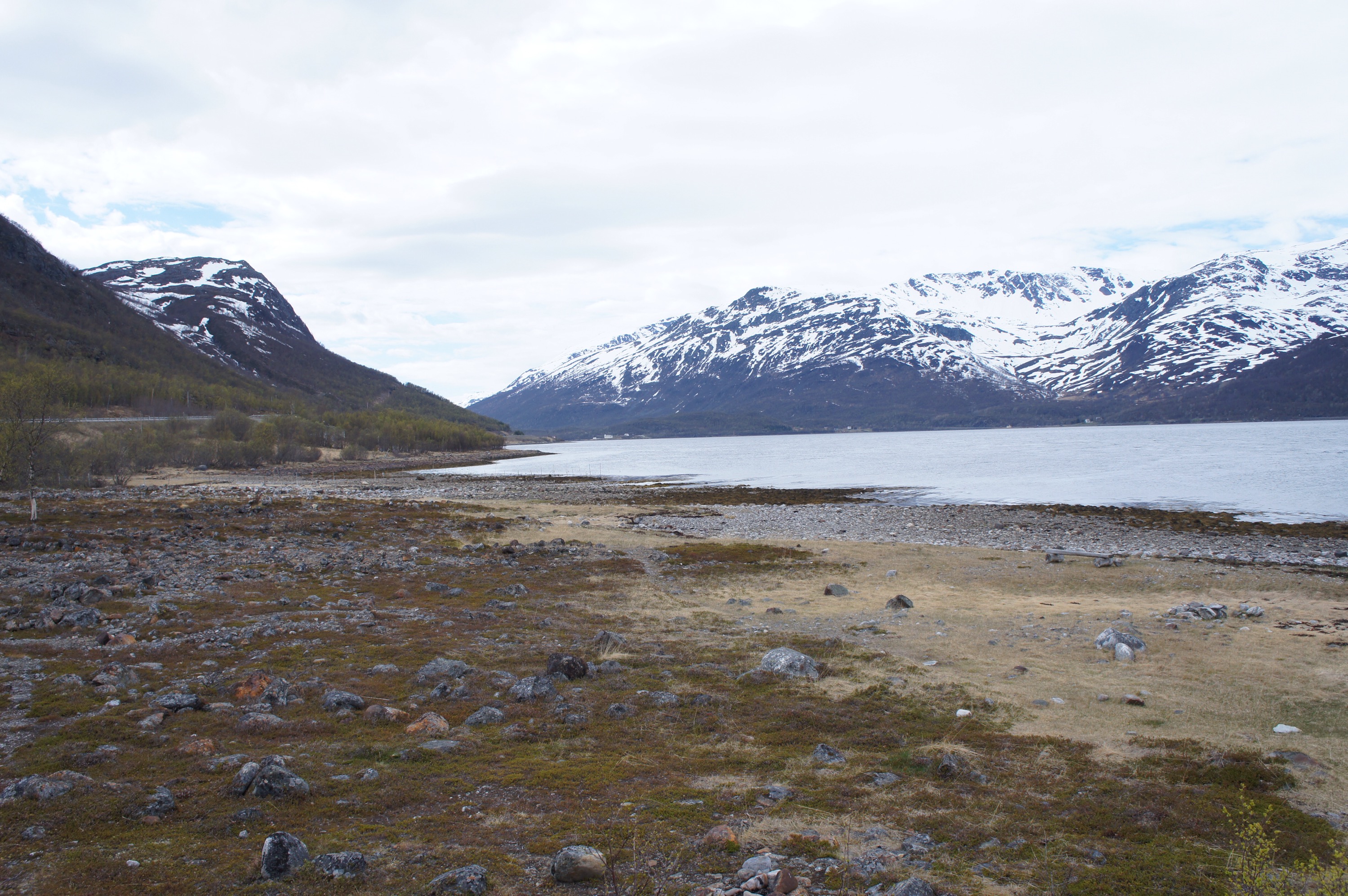 Sen vidare och så småningom ut på E8 mot Tromsö. Det blev ingen trevlig upplevelse. Tung och mycket häftig trafiksituation tillstymmelse till vägren. När vi kom till ett vägskäl valde vi att cykla dem gamla vägen i stället. Nu hade jag slut på bensin så trots att vi bara hade någon mil kvar stannade vi i en skogsdunge och lagade mat. När man inte vet var man ska ta vägen och hitta boende är det lika bra att äta innan.