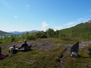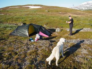 Framåt kvällen slog vi upp tältet och kröp in. Det är ändå det säkraste skyddet mot mygg och det började snart blåsa en del så det blev riktigt behagligt.