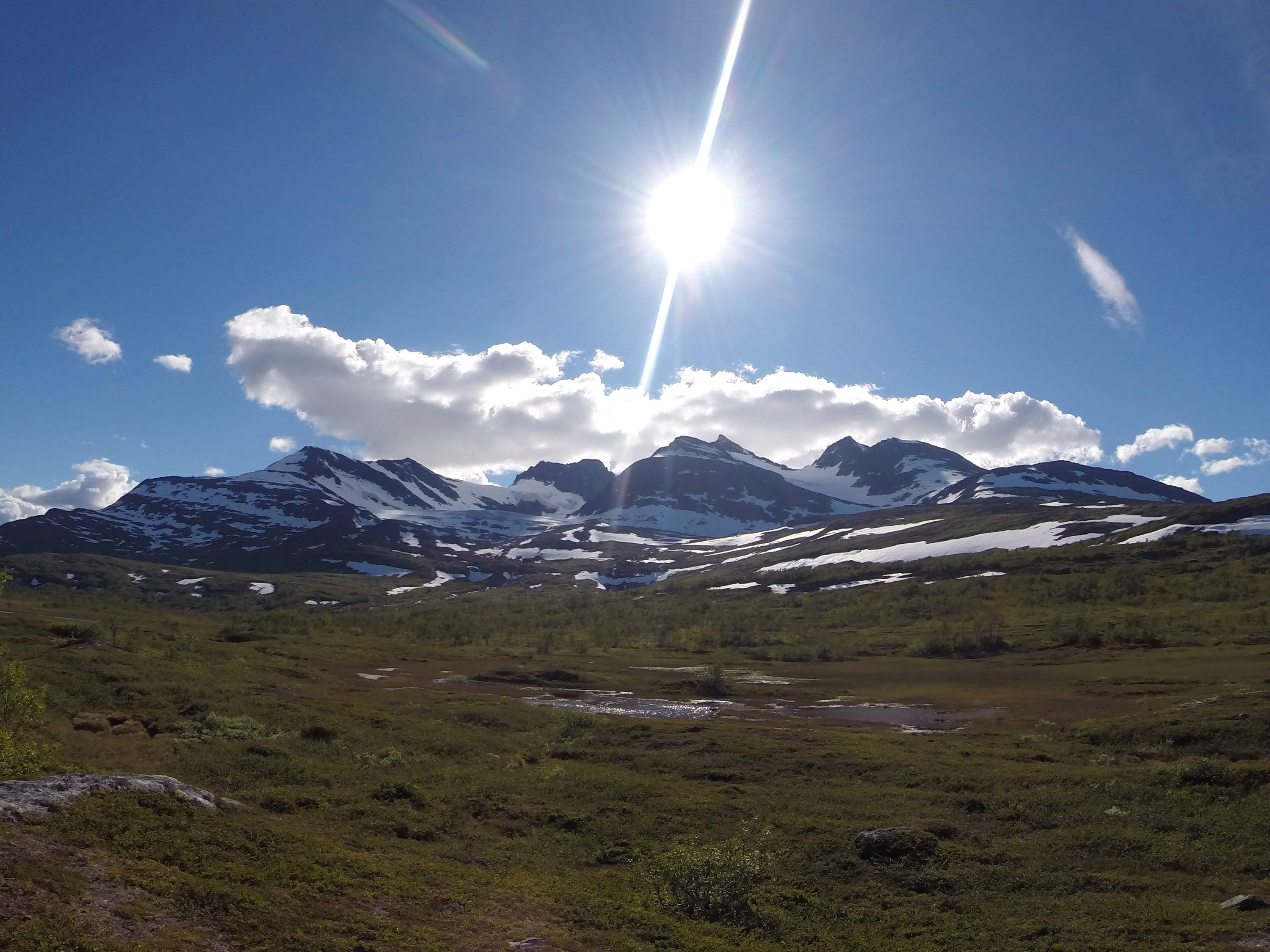 Tidig morgon med lite svalare väder trots sol så då passade vi på att knata på ner mot det mäktiga Okstindan-massivet.