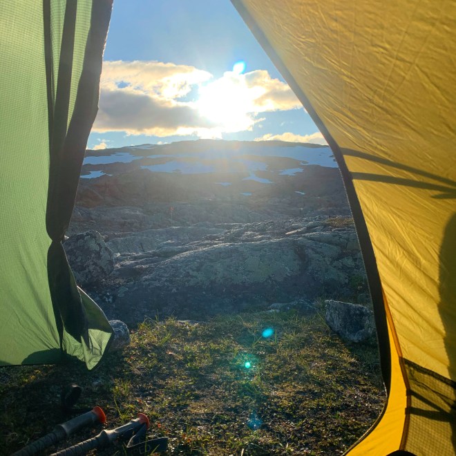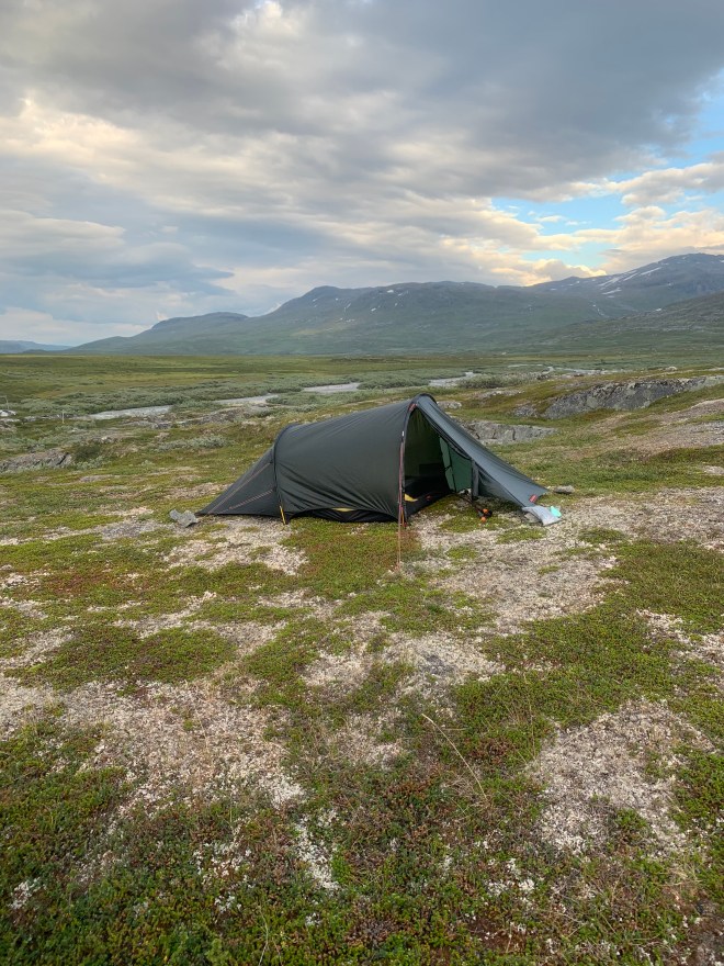 Ingenting hände och jag började fundera på om det skulle bli något men vid 22 på kvällen var det över mig. Spänd på hur mitt Hilleberg Anjan skulle klara vinden men just då glad att jag valde det framför mitt ett drygt kg lättare alternativ, Bonfus Duos i DCF, innan avfärd. Kraftig vind och ösregn. När jag ett par dagar senare pratade med stugvärden i Hukejaure trodde han det blåst upp mot 30 sekundmeter. Han hade ägnat kvällen åt att se om deras skithus skulle blåsa bort. Efter några timmar lugnade sig vinden så pass att det gick att sova men regnet fortsatte.