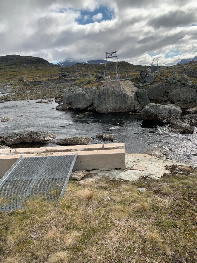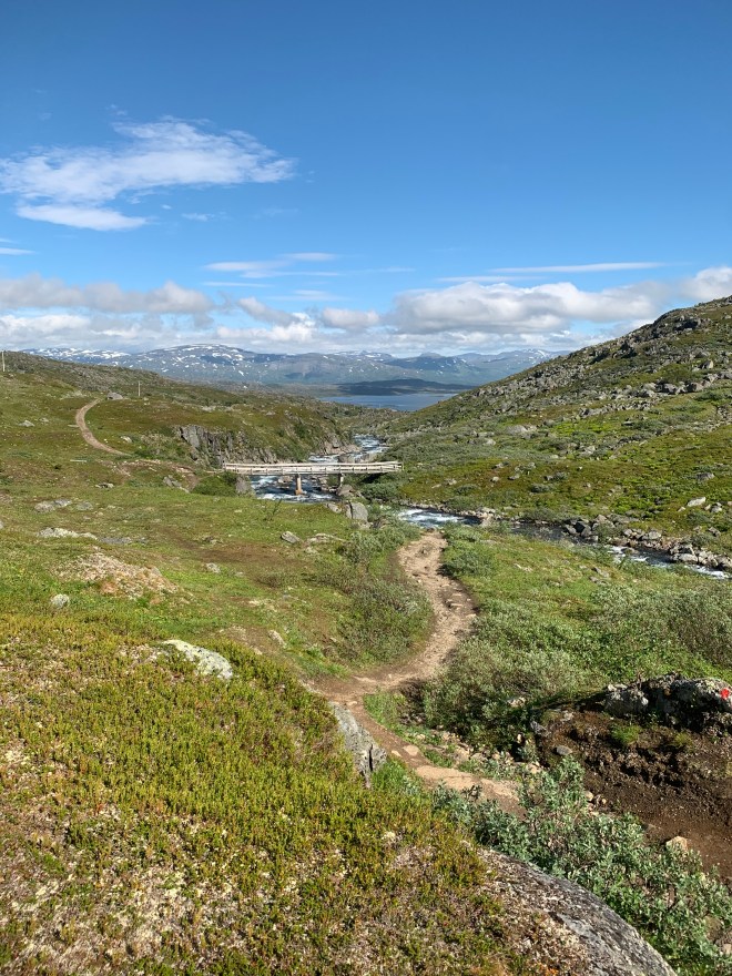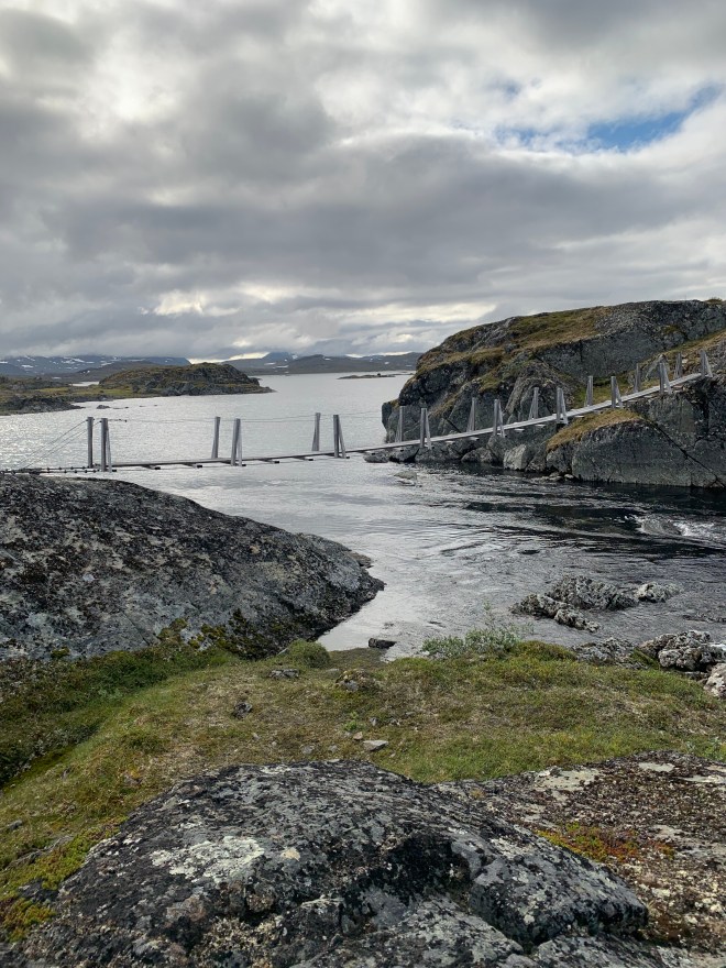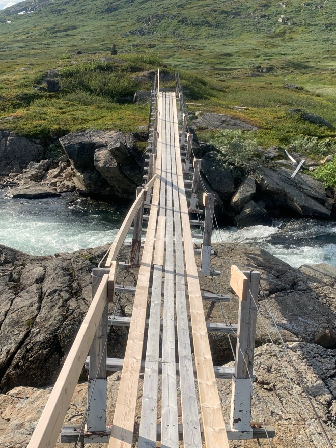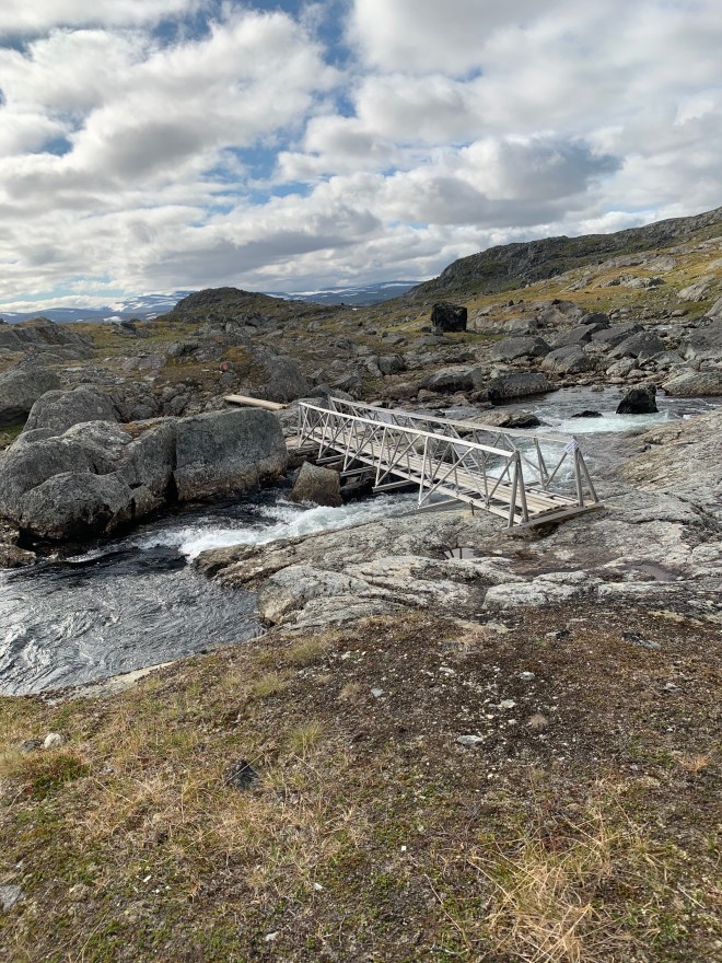 Efter några km skulle jag passera en bro över en jokk. Vet inte om de höll på att renovera den eller om den bara var allvarligt skadad av vårfloden. Platsar tveklöst på Bellas och min lista över mindre trevliga norska hängbroar vi passerat. Slår sig definitivt in på topp tre! Lösa plankstumpar att balansera på och vajrar som omväxlande gick att hålla sig i och sen plötsligt bara hängde lösa. Över kom jag!