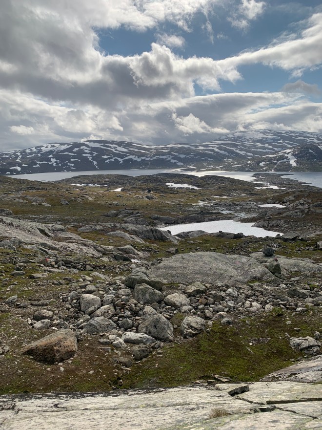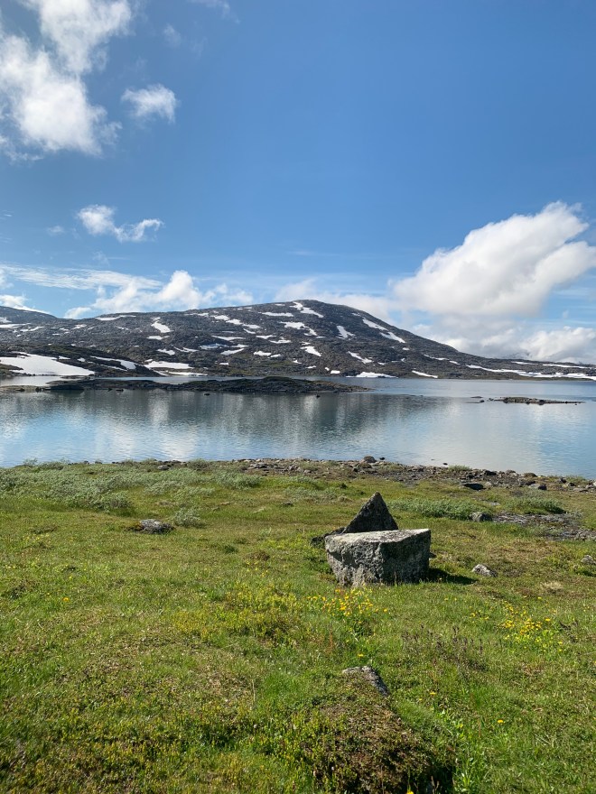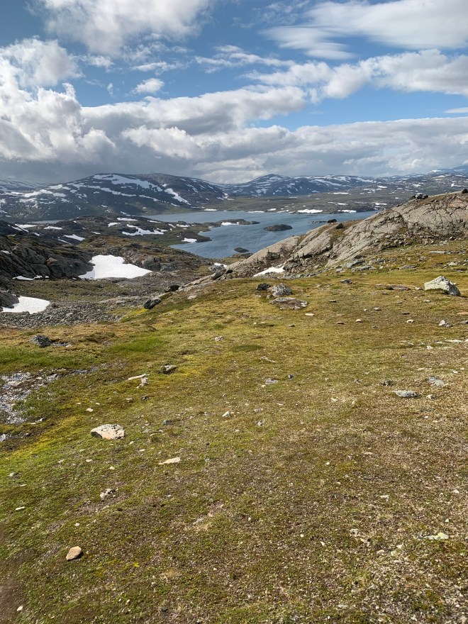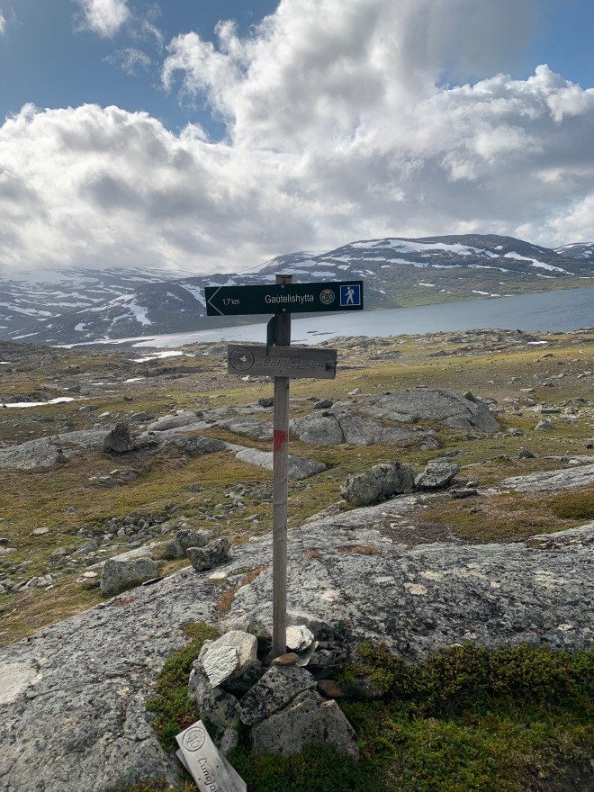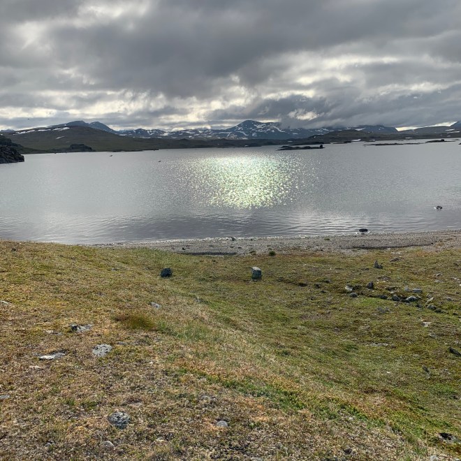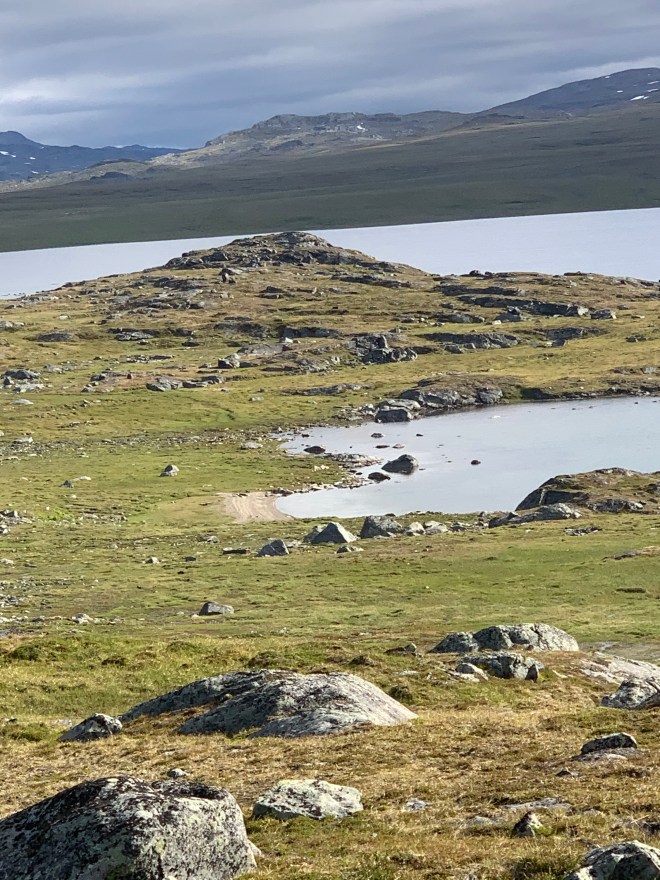 När jag gick från Gautelishytta hade jag återigen bestämt mig för att försöka hålla fötterna hyfsat torra. Den här gången gick det bättre. Solen och värmen kom tillbaka alltmer under dagen. Jag vandrade i en bedövande vacker miljö över gräsängar och utan djupare vatten att passera. Självklart blev jag fuktig av gräset men ändå inte genomblöt som tidigare.