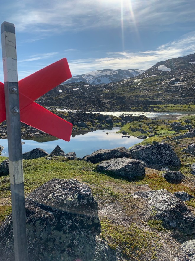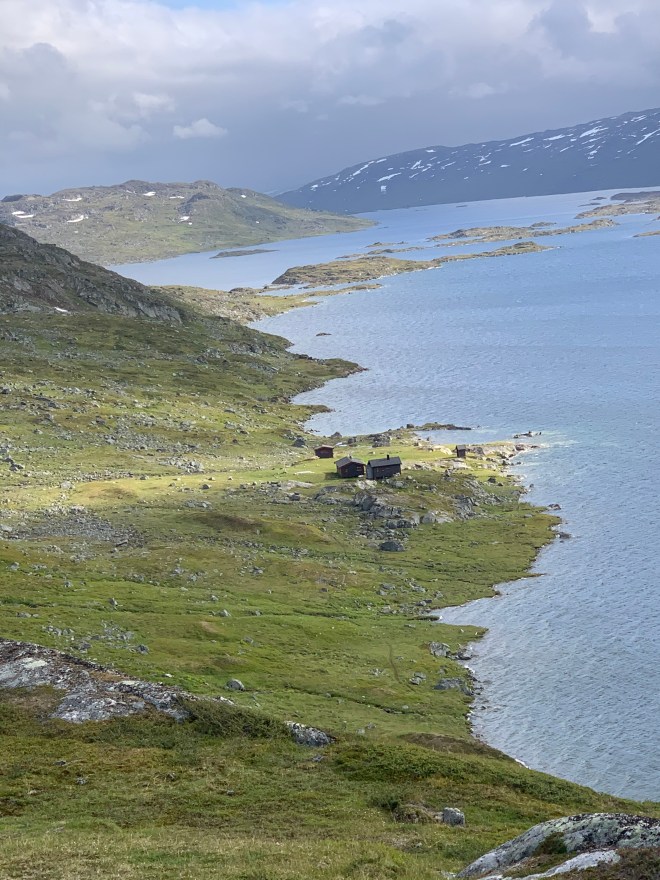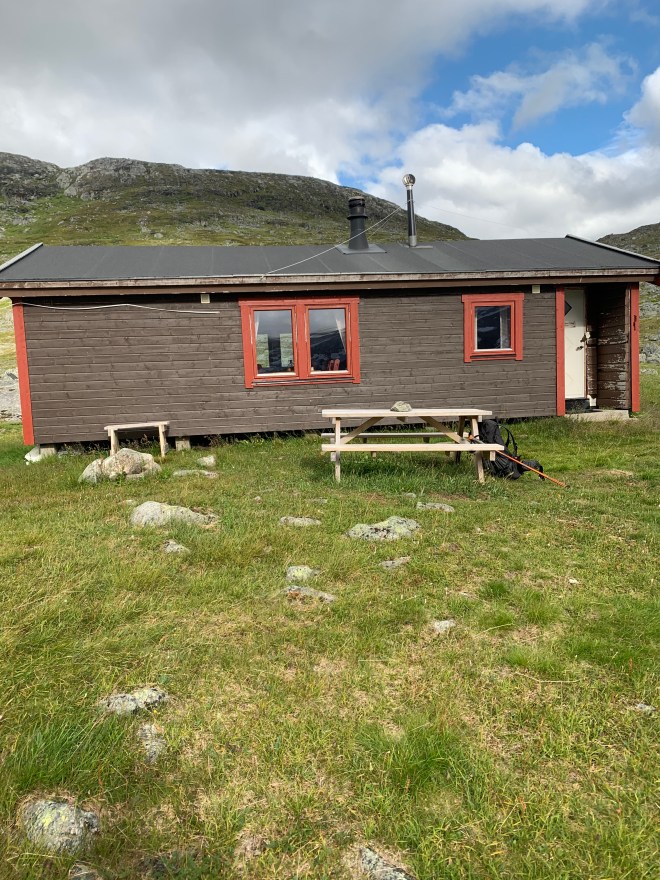 Efter lufttorkning i solen gick jag fram till DNT:s hytta på andra sidan sjön. Där satt det fem norska kvinnor från Narvik. De frågade direkt om jag tänkt bo på hyttan samtidigt som de informerade om att den var fullbelagd. Den svenska parian lyste igenom rätt ordentligt. De pratade om ovädret som var på ingång, vilket jag också sett i prognosen tidigare. Kl 20 skulle det vara över oss. De tyckte jag kunde fortsätta de 15 km till nästa hytta som säkert inte var full. Med 21 km i benen och vetskap om 350 höjdmeter på slutet av den sträckan blev svaret att jag nog hellre litade till mitt tält.