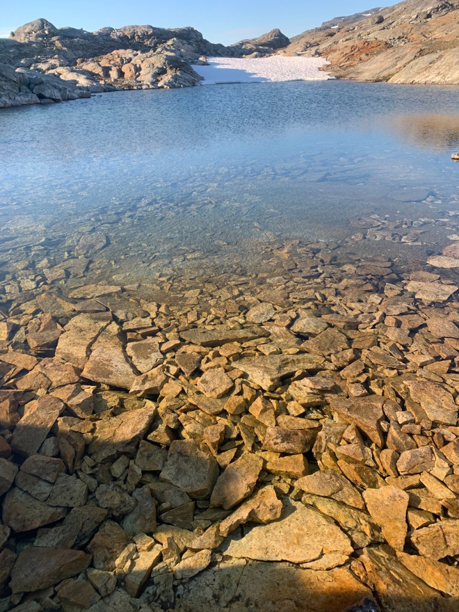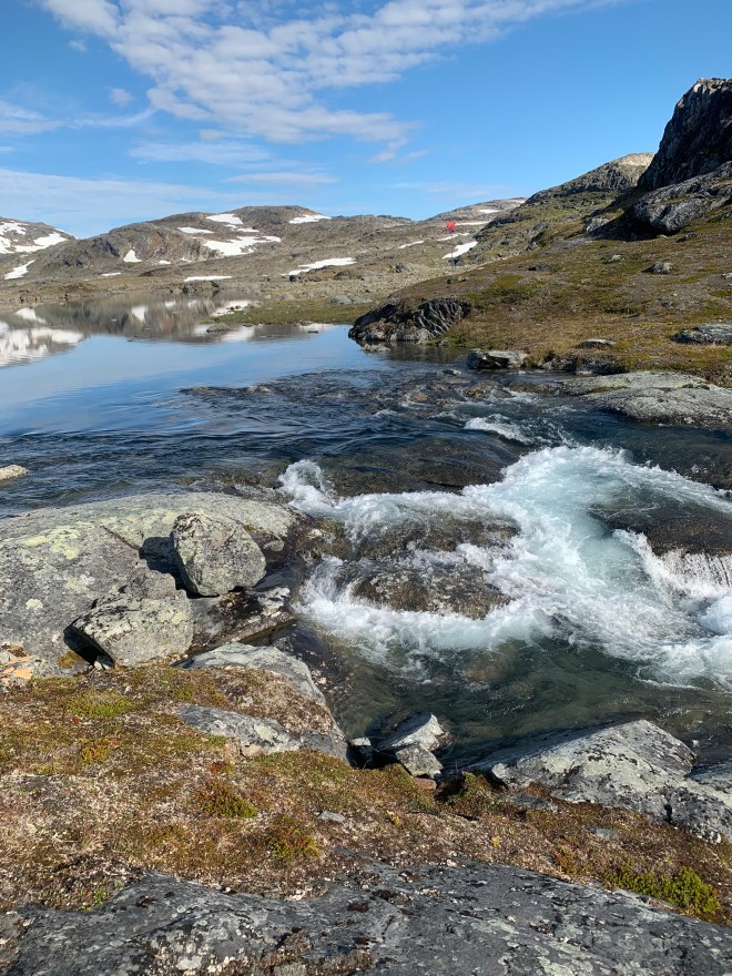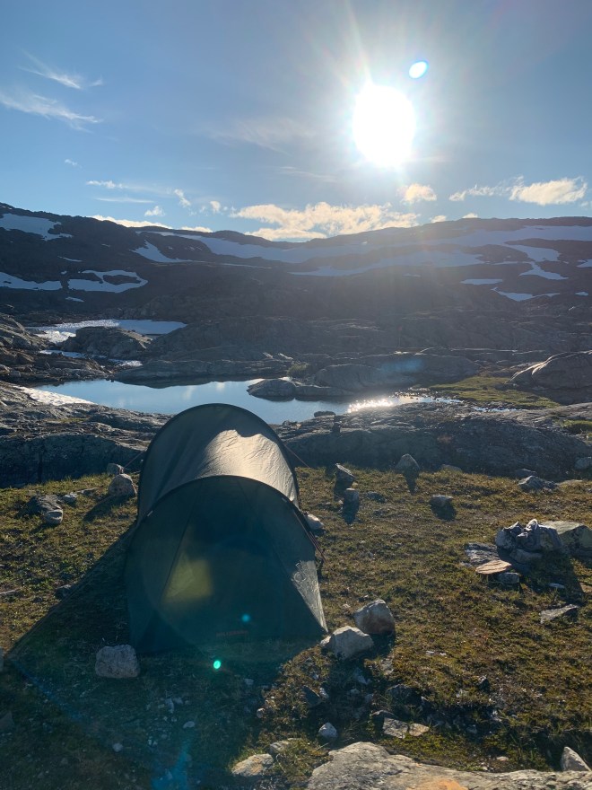 Efter 18 km i stekande sol, säkert en bit över 25 grader, fick det vara nog med höjdmeter för den dagen. Hittade en fin plats för tältet där det fläktade tillräckligt för att det nästan skulle vara myggfritt och en isande kall badbalja strax intill.