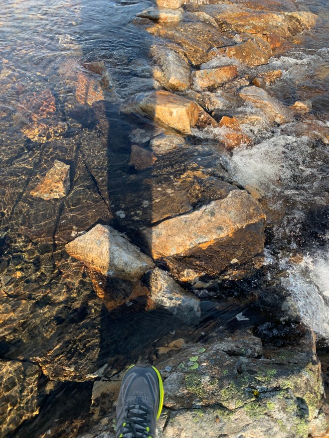 Min upplevelse av att gå i trailrunners är tudelad. Jag köper att det inte blir lika tungt som med kängor och att man därigenom orkar gå längre. Det är skönt att inte bry sig om vattendjup utan bara knalla rätt över jokkar och vad. Jag frös inte heller någon gång nu när det var så varmt. Men, i gyttjiga partier där jag med kängor bara klafsar på letar jag med skor på fötterna efter tuvor att hoppa på. Vill inte riskera trampa av mig skon i gyttjan. För min kroppsvikt plus ryggsäck kändes också mitt skoval rätt instabilt och lite ”svampigt” i balanserandet över stenpartier. Framförallt visade det sig att den ständiga blötan nötte sönder skinnet och gav blåsor, framförallt fram mellan tårna och på utsidan av framfoten. Det hjälpte inte med fotsalva och torra strumpor nattetid.