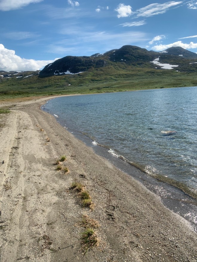 Första halvan av leden ner till Hukejaure, ca 18 km, är en sån jag gladeligen skulle göra om. Var och varannan km passerade jag en sån där plats med grönskande gräsäng för tältet, sjö med badstrand och ett rinnande vatten strax intill. Drömlägerplats alltså!