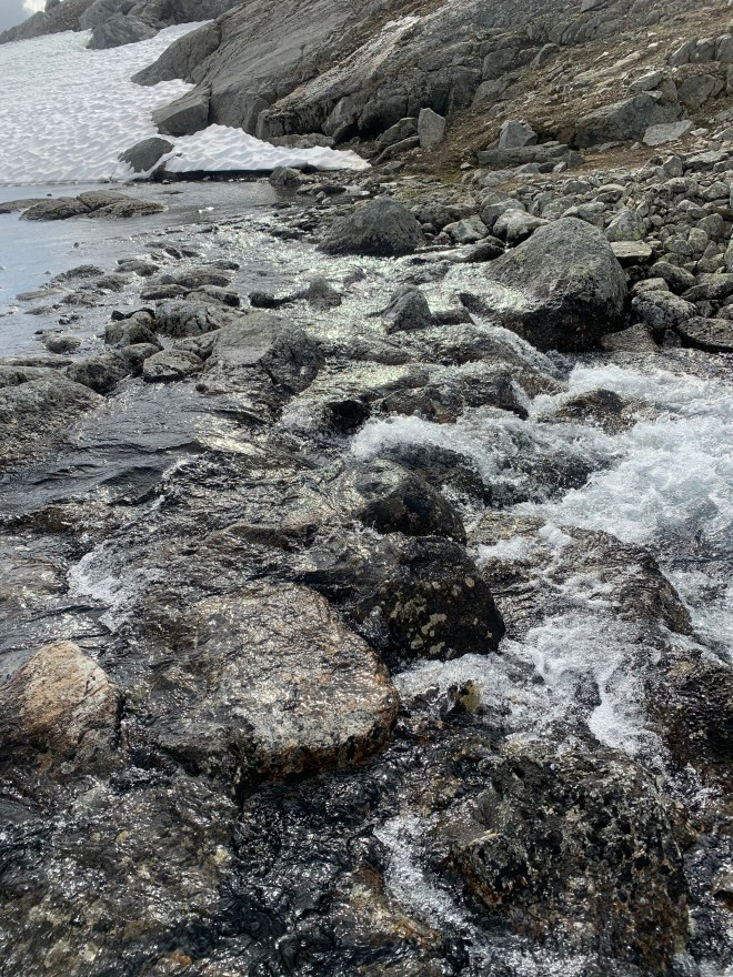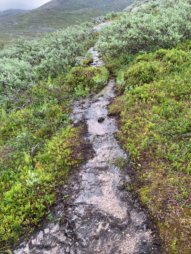 Dagen därpå var det inte en stig utan en bäckfåra jag skulle vandra i. Hade i tältet tänkt försöka hålla mig hyfsat torr för att skydda fötterna lite. Gav upp den tanken efter 50 meter. Vatten precis överallt. Gick de 8 km med 350 höjdmeter upp till Caihnavaggehytta där jag tog en tidig lunch.