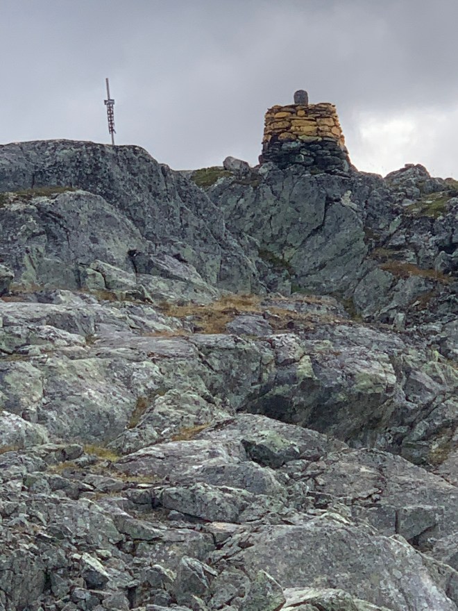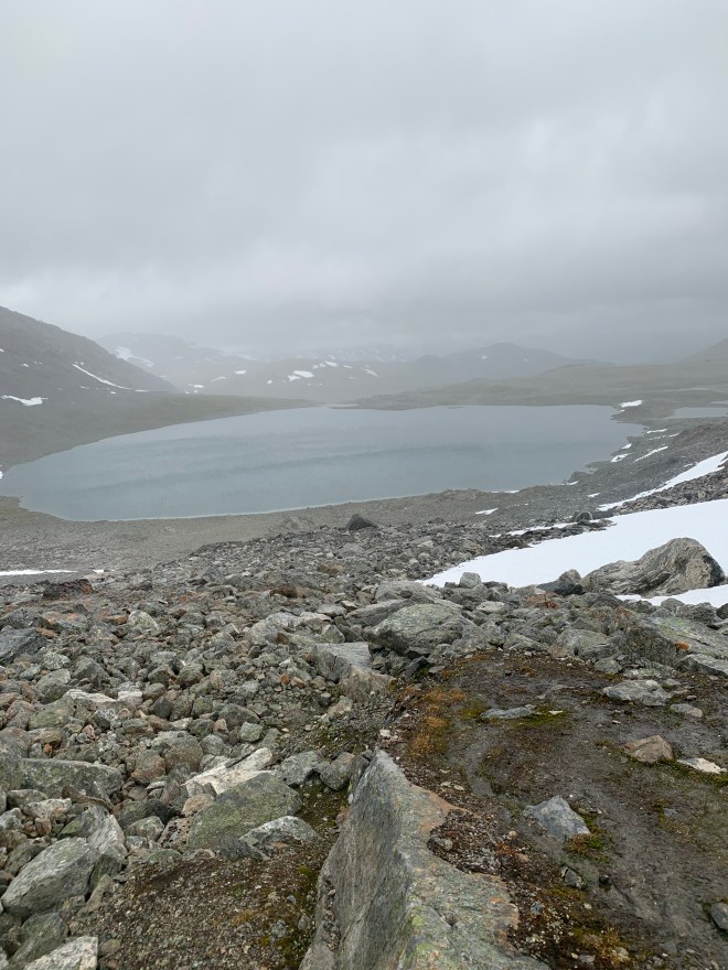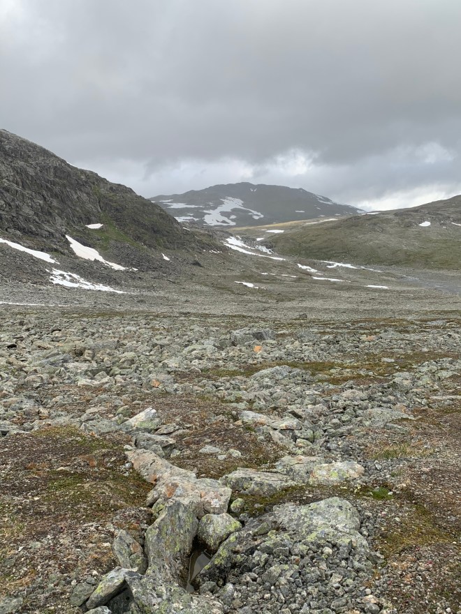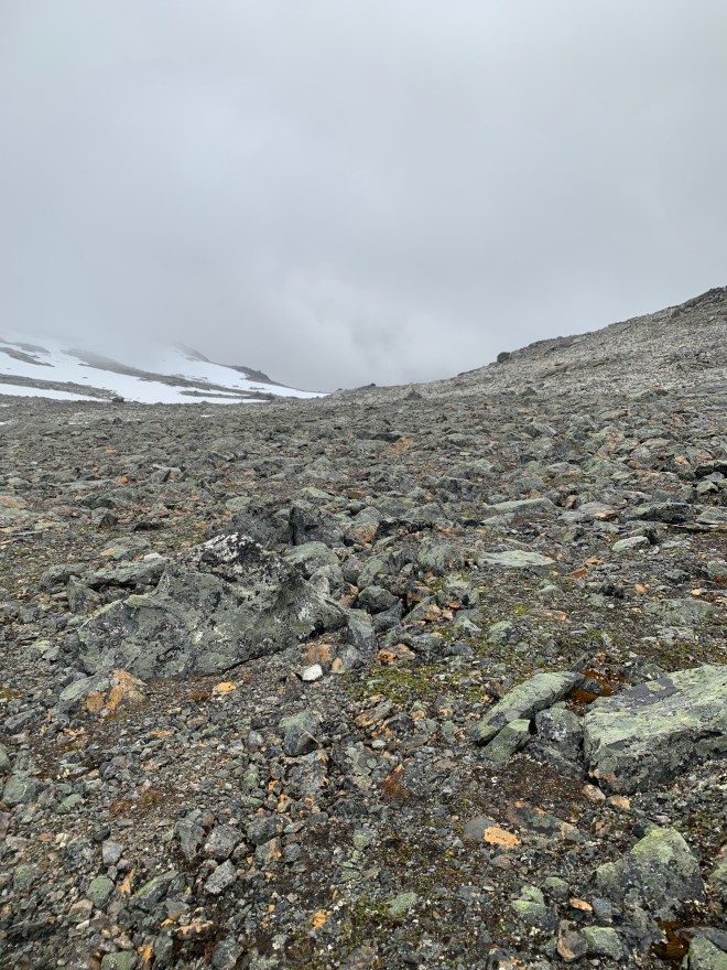 Sen tog den här turens tuffaste passage vid. Ytterligare drygt 200 höjdmeter upp i ett pass från norra sidan. Räknade med stenig terräng när jag kollade kartan hemmavid men inte att det skulle vara så lång sträcka med stigning i blockstensfält. Och nu duggregnade det naturligtvis och blåste en del också. Gjorde inte det redan hala, riskabla balanserandet lättare direkt. Det gick inte fort men till slut var jag över till passets södra sida, Betydligt kortare stenfält där men det räckte gott som det var. Så fort jag kom ner några hundra höjdmeter blev både terräng och väder bättre.