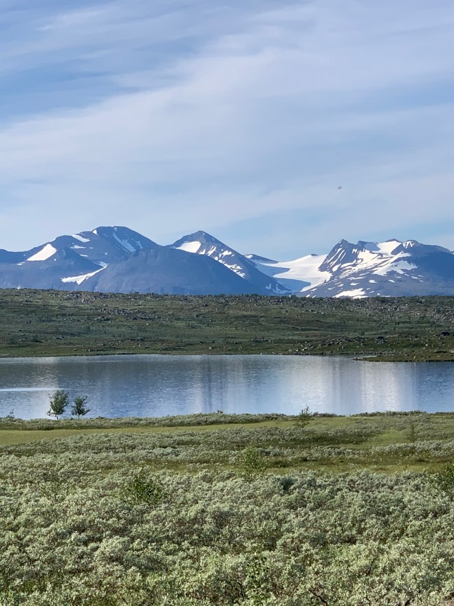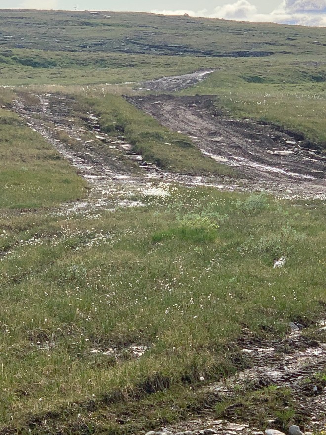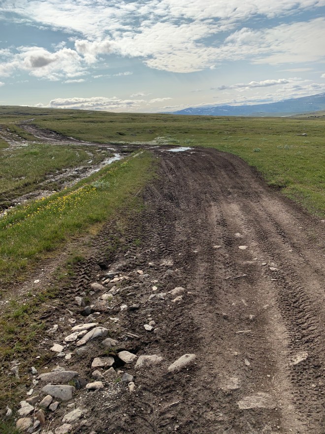 De två milen mot Sitasjaure har Bella och jag vandrat på vår NPL så jag visste att det var en relativt lättgången transportsträcka. Ramlade på i god fart över stora öppna ytor i stekande sol. Undrar hur många liter jag svettats på den här turen? Passerade samevistet vid Sitasjaure och den sista milen fick jag följa, de ofta sönderkörda, fyrhjulingsspåren fram till dammen och STF:s stuga. Pratade en stund med stugvärden men det gick knappt att stå still där på grund av myggen. bestämde mig för att fortsätta en bit till för att inte ha alltför lång sträcka längs grusvägen ner till Ritsem på förmidagen innan bussen skulle gå.